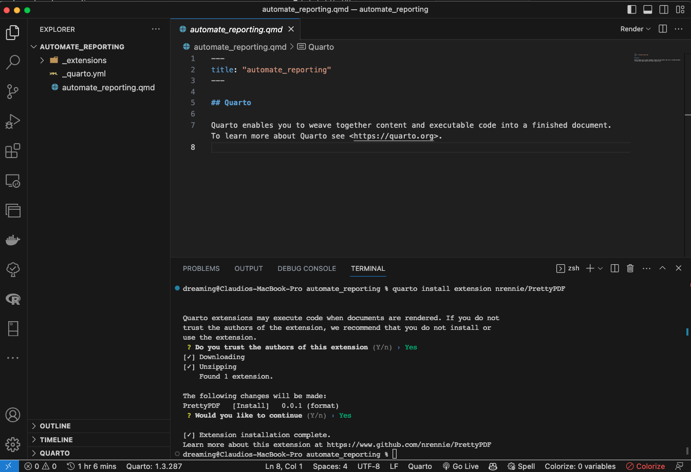 To make our lives easy we will install a pretty cool quarto extention called PrettyPDF, which will help us to make our pdf reports look better. To install the quarto extension and use the template file: